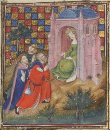 This illumination depicts a statue of the goddess Opis, who was also known as Ops, or Rhea in Greek Mythology. She is illustrated wearing a blue dress and sitting down with her hands pointing outwards as she wears a crown. The statue is situated inside of a temple. There are three citizens approaching the statue and looking up to it with an appearance of desperation. The man wearing red has his arms crossed over his chest as he is most likely praying to the goddess. Boccaccio explains that this statue was brought to Rome during the Second Punic War so the people could perform sacrifices and rituals for the goddess in exchange for help in the war.