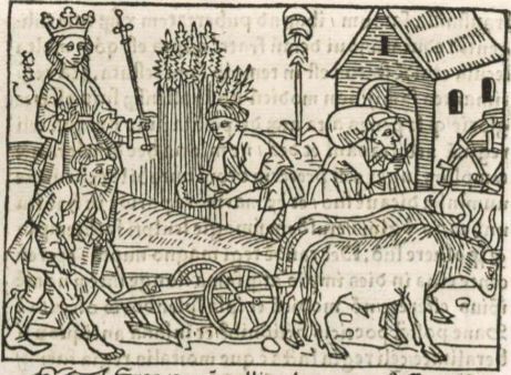 Ceres is illustrated on the left-hand side of the engraving wearing a crown and holding a scepter. We know this is Ceres as her name is engraved horizontally adjacent to her body. We also know this is Ceres as she is the goddess of harvest, which is what this engraving depicts. Boccaccio explains that after discovering agriculture, Ceres had tamed oxen and trained them to yoke. She also discovered planting seeds and then taught men how to harvest them once they matured. There is one man plowing the fields with the oxen, and another in the background husking grain. There is another man with a bag of flour over his head, as Ceres also taught men how to turn flour into an edible fare. Ceres wears the crown and scepter to signify her importance linked to agriculture and harvest.