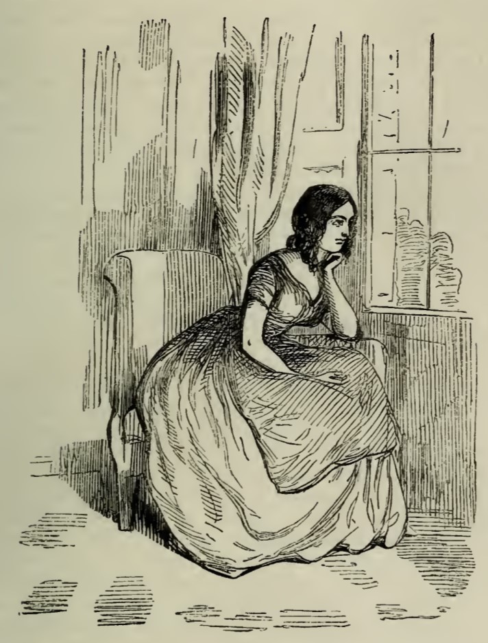 - Amelia Sedley is seated in a one-armed chair in the corner of a room. The curtains on the window have been drawn back and she is gazing out while thinking about George Osborne.