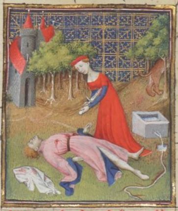 This illumination depicts a young maiden named Thisbe after finding her lover, Pyramus, dead in the forest. The lovers were meant to meet at the fountain depicted on the right side of the image where they would run away together. Boccaccio explains that when Thisbe arrived at the fountain, a lioness appeared, and she ran into the trees to hide. She left behind a cloak which the lioness picked up in her already blood-stained mouth. When Pyramus arrived, the lioness was gone, however she left the blood-stained cloak of Thisbe. Pyramus believed Thisbe to be dead, so he plunged his sword into his chest. There is a wound visible on his chest in the image as he lies on the ground. The blood-stained cloak of Thisbe is lying next to him. The lioness is illustrated in the background on the right-side walking into the forest. Thisbe is illustrated leaning over Pyramus’ body, as she reaches down towards his sword. She ends up using his sword to kill herself.