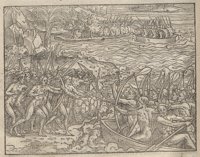 A group of Indigenous Brazilian woman, called ‘Amazons’ by the author, fight against a group of Indigenous Brazilian men who attack from the water. The women fight with bows and arrows, spears and shields, while the men in canoes use bows and arrows and clubs. The women are unadorned with their hair worn unbound. Some of the men wear feathered headdresses. This image is identical to one found in Frankfurt, 1557.