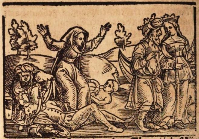 Hypsipyle and her father, King Thaos of Lemnos, are depicted on the right side of the engraving. Hypsipyle is depicted speaking with her father as she tells him that the women of Lemnos are planning to turn on all the men of the city and kill them. Boccaccio explains that Hypsipyle warns her father of the crime so that she can help him escape. There is a woman on the left side of the engraving with a sword in her left hand and a man’s head in her right as she carries out the plan to kill the men of the city. Later in life, Hypsipyle had a ward named Archemorus. He is depicted in the centre of the engraving, lying on the ground with a snake biting into his chest. This kills the child, and Hypsipyle is illustrated with her hands in the air as she grieves for him.