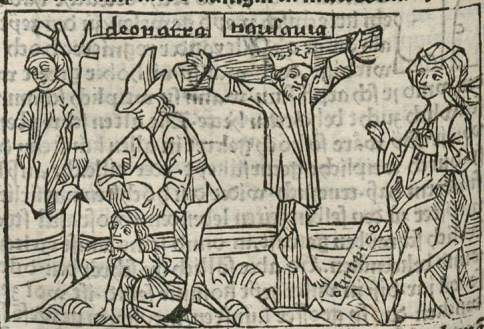 This engraving depicts Olympias of Macedon on the right side of the engraving approaching a man hanging on a cross. We know that this figure is Olympias as her name is engraved beside her body. The man being crucified is Pausanias, a man who helped Olympias with the murder of King Philip of Macedon (husband to Olympias). Boccaccio explains that Olympias placed the golden crown that Pausanias is wearing on his head to honour him and reward him for the assassination. Along with getting her husband murdered, she also had her husband’s new wife and child murdered out of anger. Cleopatra, King Philips other wife, is pictured on the left side of the engraving hanging by her neck on a tree. Her name is engraved above her head. Cleopatra’s child is depicted sitting on the ground as one of Olympias’ servants is bashing her head with a rock.