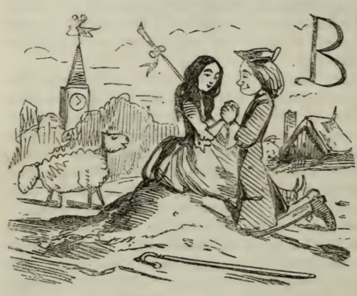 A scene depicting the simple and happy country life. A shepherdess is depicted sitting on a small hummock, where a man in uniform kneels before her, clasping her hand in his. Both are looking contentedly at the other. Her crook lies on the ground beside the hummock, and behind it is one of her sheep. In the background are a farmhouse and clocktower, and the top right of the image is the letter B from Besides.