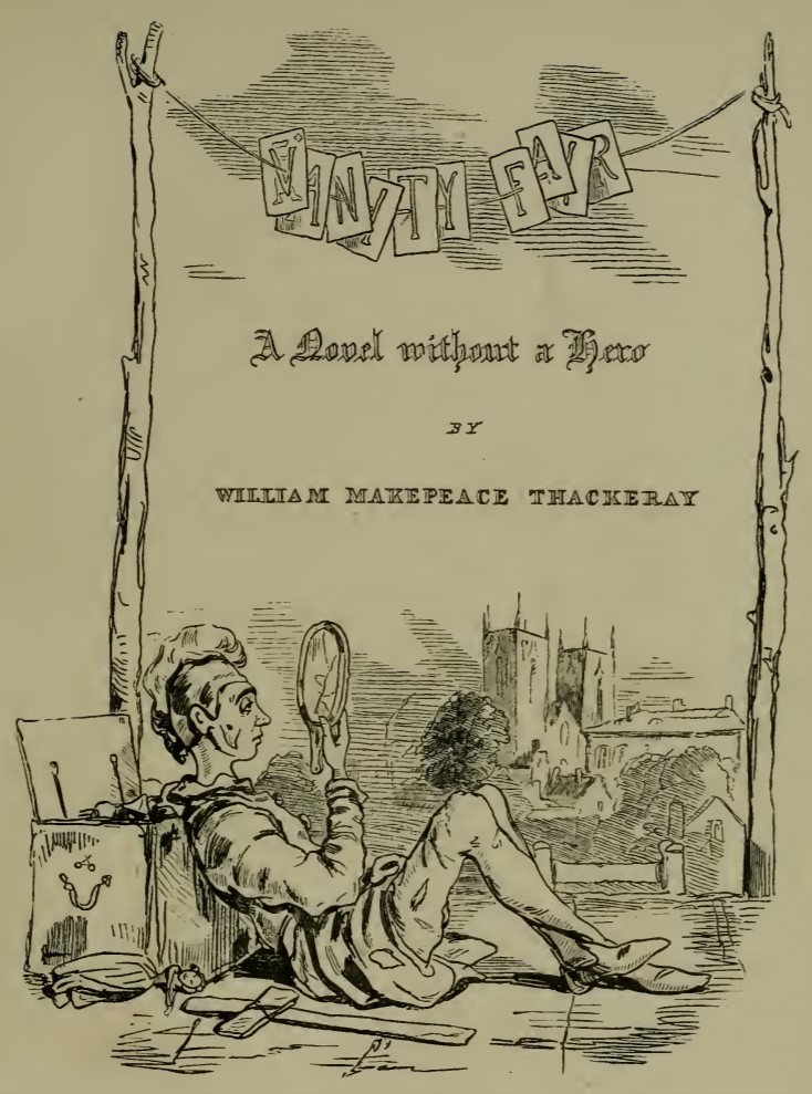 Two sticks-the left one forked, the right one pointed-hold up a banner with the title Vanity Fair. Each letter is on a separate piece of paper, connected by a string tied to the sticks. Beneath the banner is printed the subtitle and author, A Novel without a Hero by William Makepeace Thackeray. At the base of the banner, a haggard man with a plumed helmet is lounging against an open chest, holding up a mirror from which he peruses his reflection. By his side are a doll and what appears to be a handmade axe or hammer, with a flat rectangular stone or piece of wood tied to a longer, thinner stick. In the background can be seen trees, a fence, and several buildings.