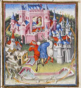 Dido purchased a piece of land on which she would create Carthage by making a deal that the size would be only as large as the area that an ox hide could cover. She was very smart, and cut the hide into thin strips, creating a much larger property than the sellers expected. The hide is represented in the image as the brown circle encompassing the people and the buildings. In the window of the palace, Dido prepares to commit suicide in front of Aeneas. Onlookers watch in despair, seeing what she is about to do.
