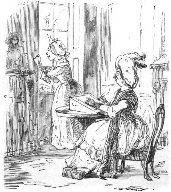 To the left of the image, Miss Jemima is standing in front of a window, from which she is watching the arrival of the Sedley carriage. Miss Pinkerton, wearing a feathered turban, is in the foreground. She is seated at her desk with feet on a raised footrest and writing on a sloped block.