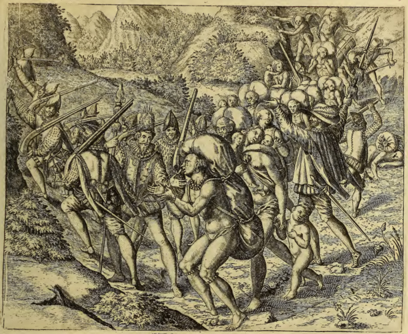 A group of Indigenous men, women and children have been captured by the Spanish and are forced to march to a new location. Many of the Indigenous men carry large bundles on their backs while the women carry the smallest children. The Indigenous people are surrounded by Spaniards carrying thin swords and muskets. Near the front of the group, an Indigenous man with strands of beads around his neck, wrists and knees converses pleadingly with a Spanish man walking near him. One Spaniard beats an Indigenous man who has fallen near the back of the group.