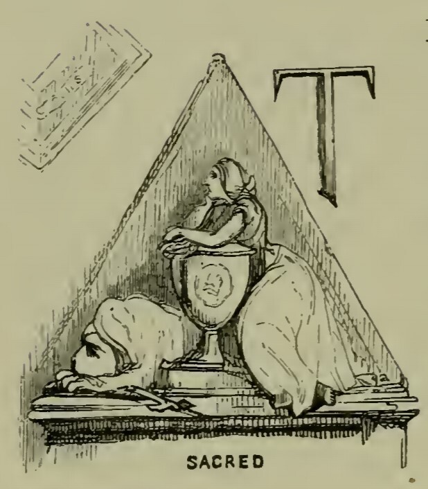 Inside of a triangle, a woman leans over a large trophy with one hand on her chin. At the base of the trophy are a cross and a shape that may be a sphinx or a large dog. Beneath the triangle, the word SACRED is printed. Above the left side is a cut-off, layered rectangle, and above the right side is the letter T from The.