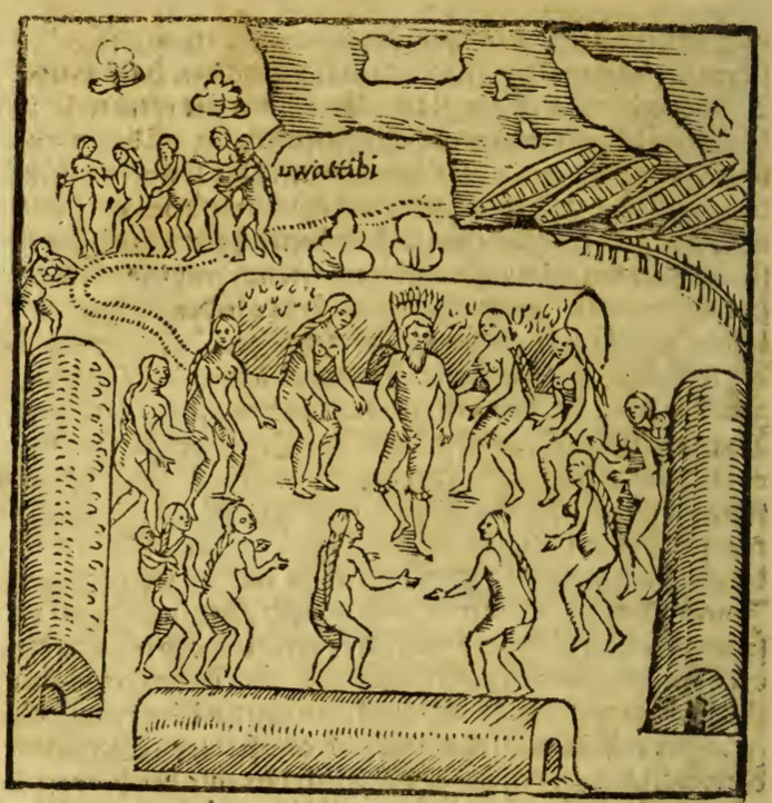 A small Tupinambá village is shown. There is a fence around part of the perimeter facing the ocean. There are four long structures arranged in a square. A path leads from the village to the ocean where several canoes are anchored along the shore. A group of Indigenous Tupinambá women with braided hair, two of whom have infants in carriers on their backs, dance in a circle around a bearded man who wears a feathered headdress in the center of the village.