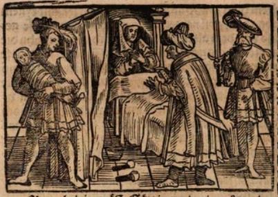 Ops (also known as Opis), the wife of Saturn, is depicted laying in a bed after just having given birth to her children: Jupiter, Neptune and Pluto. Jupiter is illustrated being carried away to safety by a servant on the left side of the engraving. Boccaccio explains that Saturn and Ops’ brother, Titan, planned to kill the newborn babies to avoid them growing up and defeating them. Saturn is illustrated with his hands outstretched towards baby Jupiter. Titan is at the foot of Ops’ bed with a sword in his hand.