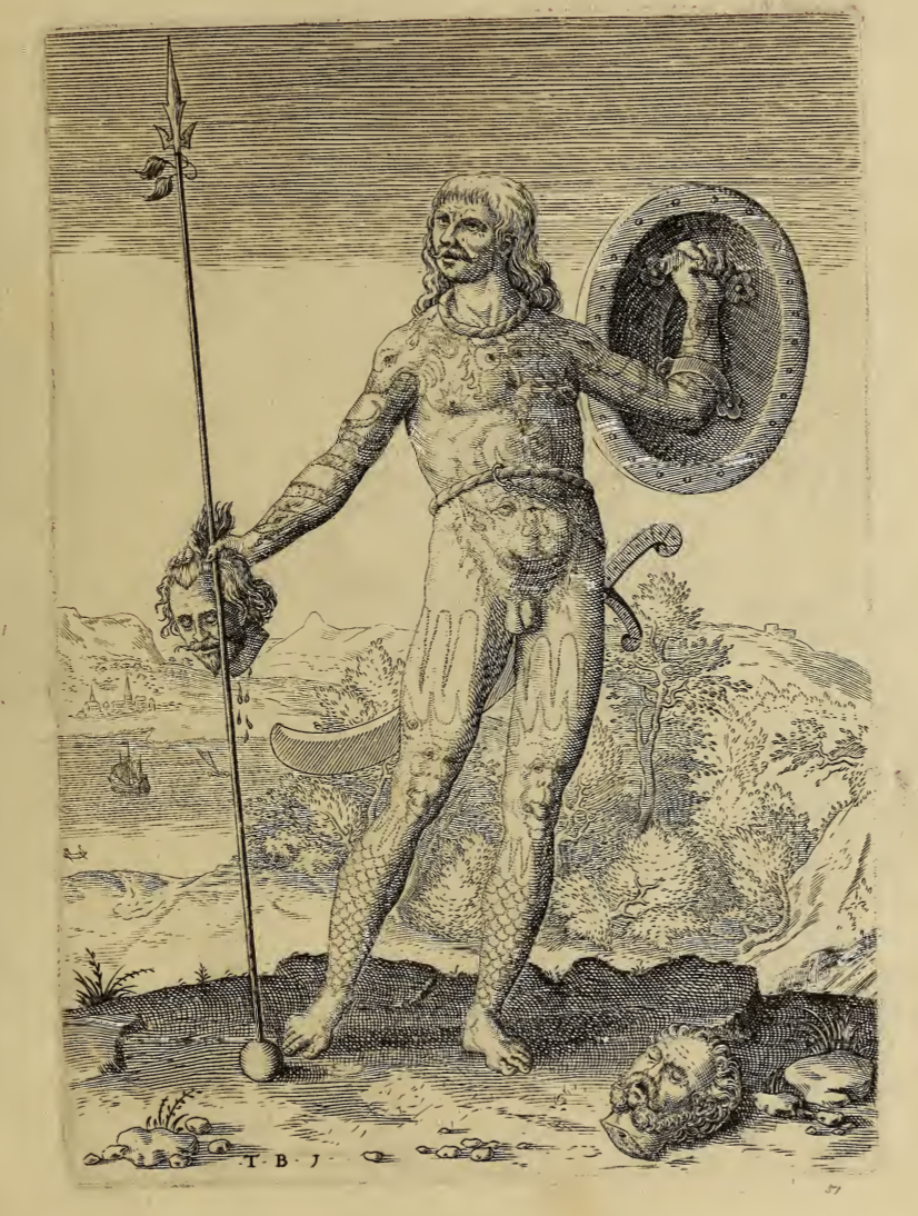 An Indigenous man is shown from the front. He carries a shield strapped to his left forearm and a long spear in his right hand. Also in his right hand is a severed human head, another head lays on the ground at his feet. His hair is long, he wears a twisted cord around his neck, and a sword with a curved blade hangs from another cord around his waist. He is nude, and his body is covered in painted designs. The Picts were an Indigenous group who lived in Britain long before the author’s time. Images of Picts were included in this book so that readers could compare their customs to those of the Indigenous people living in Virginia.