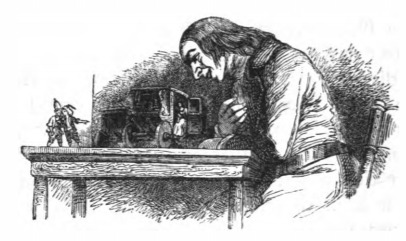 In this image Gulliver is seated at a table looking at a Lilliputian carriage. There is a woman from the court inside the carriage that Gulliver speaks to. Two men are on the edge of the table talking to each other. These men are the driver and the finance minister. They had come to inform Gulliver that he would have to leave Lilliput as it was too expensive to keep him there and feed and clothe him. The same image appears in the 1839 Krabbe edition.