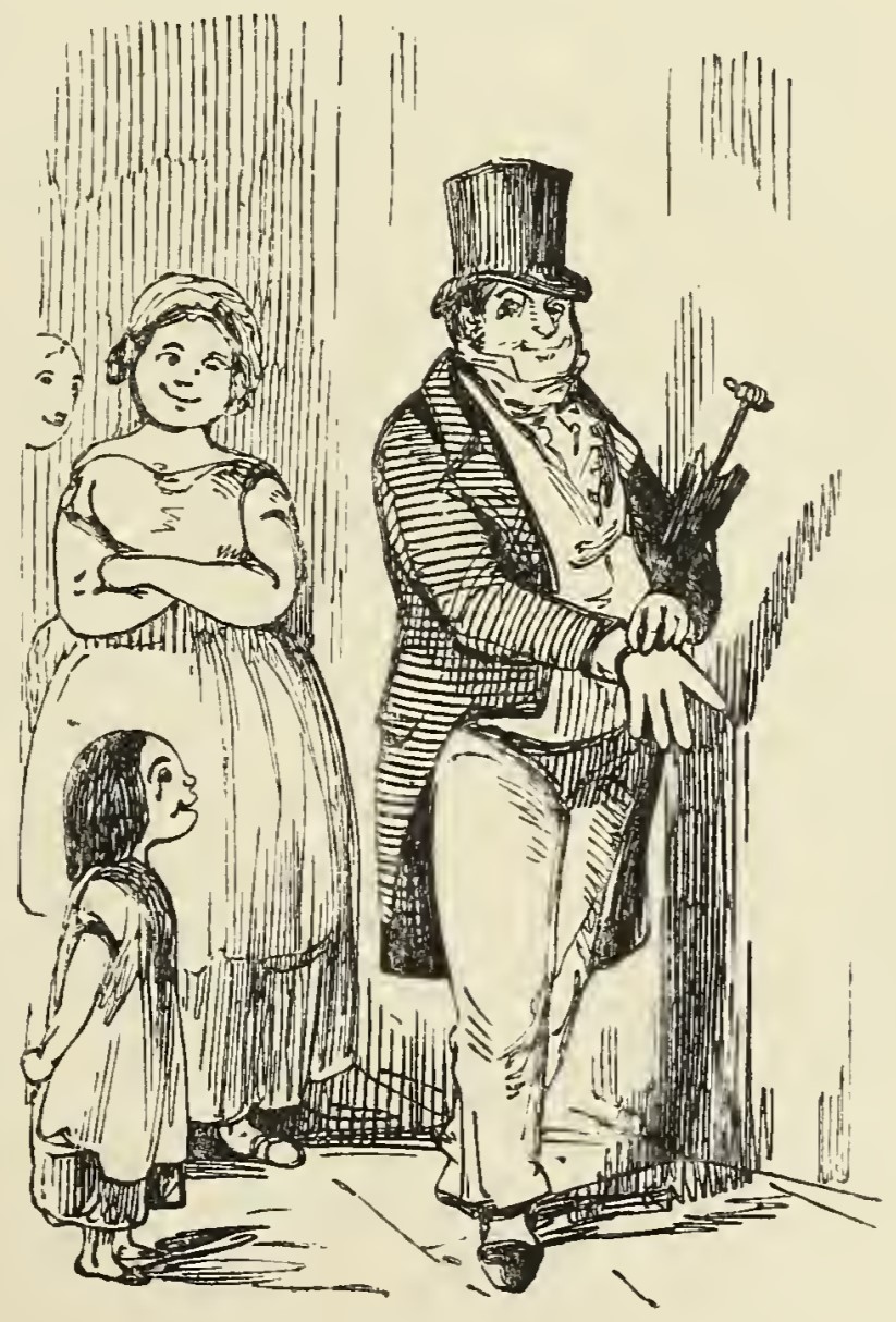 Mr. Chopper, Mr. John Osborne’s clerk, has dressed in his best suit and frilled shirt to meet his client. He is putting on his gloves and has an umbrella tucked under one arm. Beside him, his wife is smiling with her arms folded, and one of his daughters looks up at him eagerly with her hands behind her back. Another one of his children can be seen peeking around the corner, also smiling.