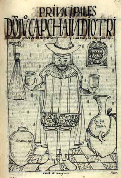 This image depicts an indigenous man named Don Juan Capcha, standing in the centre of the page holding cups filled with wine and other alcohols. He appears to be standing in a wine cellar as there are large vases that are labelled as, uino añejo [old wine] and chicha fresca [fresh alchohol]. The drunkard is dressed in Spanish clothing and has a beard. The author describes this man to be an enemy of all Christians for being a liar, thief, and a drunkard at the expense of poor natives. The caption at the bottom of the image reads, en este rreyno [in this kingdom].