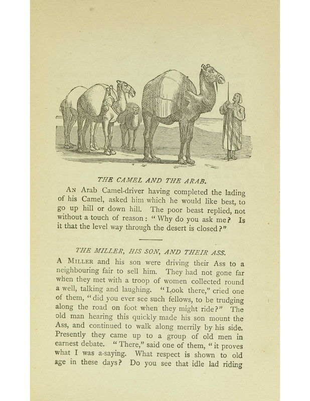 - Three camels with cloths draped on their backs are standing in a group. A man stands next to the first camel, looking up at it and holding a long stick in his hands.
