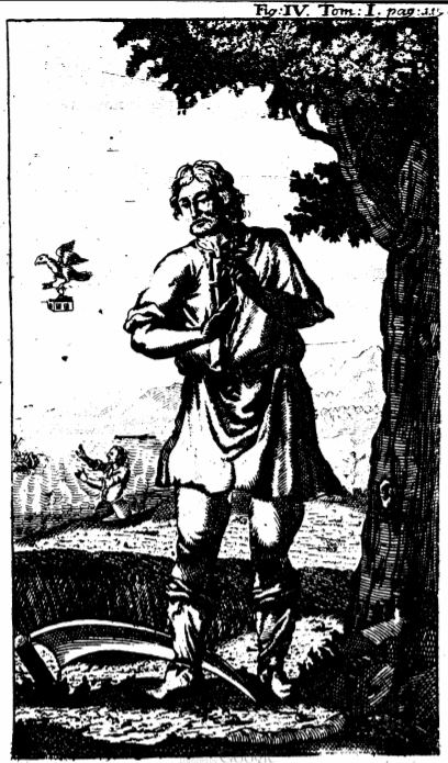 This image represents Gulliver’s adventures in Brobdingnag. The central figure is the farmer who first discovered Gulliver, standing under a tree. The Giant holds Gulliver in his hand, showing the reader the difference in size between Gulliver, and the Giants of Brobdingnag. In the background, we see an eagle carrying a box, depicting the episode in which Gulliver left Brobdingnag, as the box in which he lived and travelled was picked up by an eagle, and carried over the open water, before the eagle dropped Gulliver into the ocean, later to be discovered by a ship. We see another giant in the background, close to the water, presumably the page who left Gulliver’s box unattended, thus allowing it to be picked up by the eagle. This image is the same as that in the 1727 German von Wiering edition.