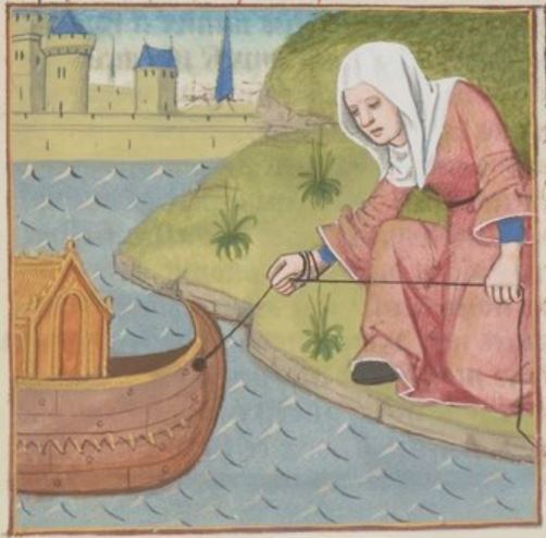 This illumination depicts Claudia Quinta, a Roman matron, standing on land as she pulls a ship towards the shore. Boccaccio explains that after Claudia Quinta was accused by other matrons of not being chaste, she prayed to the goddess Ceres to help prove her virtue. After a ship that contained a statue of Ceres had gotten stuck on a sandbar, Ceres gave Claudia Quinta the power to pull the ship to shore as proof of her chastity. The city of Rome is illustrated in the background of the image.