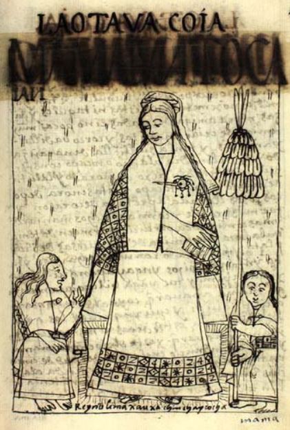 This illustration depicts Mama Runtocaya, the eighth queen to the Inca kings of the Inca Empire. She was married to Viracocha Inca, the eighth king of the Inca Empire. She is depicted standing in the centre of the image wearing traditional garbs that are embroidered on the sleeves and at the bottom of the skirt. There are two other people in the image, possibly two of her many children. The author explains that this queen enjoyed raising crocodiles. The words Reynó Lima, Xauxa, Chinchay Cocha are written at the bottom of the image, which translates to He reigned to Lima, Jauja, Chinchayqucha. These are the regions that her and her husband reigned over.