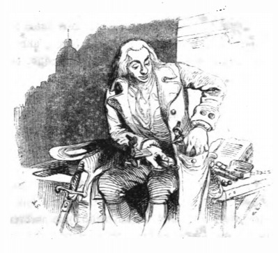 In this image we see Gulliver in his house in Lilliput. One of his pages in Lilliput is in his left pocket, into which Gulliver reaches. The other is sitting on Gulliver’s right knee writing on a tablet with a stylus, recording details about Gulliver’s life and where he comes from. Gulliver’s hat and sword are on Gulliver’s right, and behind Gulliver on his left is a book, his telescope and a small box. The same image appears in the 1843 Krabbe edition.