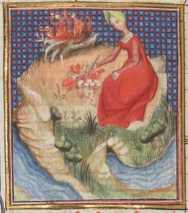 This image depicts Manto, the daughter of the famous seer Tiresias. She is depicted sitting down beside a fire as she looks through a pile of animal entrails. Boccaccio explains that Manto became an incredible seer just like her father. She used the movement and colour of the fire’s flames to tell the future, which is why there is a fire in the engraving. She also used the entrails of animals such as sheep and oxen for signs of the future. Boccaccio explains that Manto was also involved in the dark arts by summoning spirits and gods from the underworld.