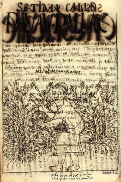 The author explains that there were ten paths for women to follow in the Inca Empire based on age division. This group was called pauau pallac [flower pickers]. These women were daughters of common people that were aged from nine to twelve years old. Their duties included flower and herb picking and aiding their parents with chores. The young short-haired girl illustrated in the image is depicted picking many flowers. The caption on the image reads de edad de nueue años, de la comunidad y ciruan a las prencipales señoras, which translates to nine years old, for the community and they serve the noble women.