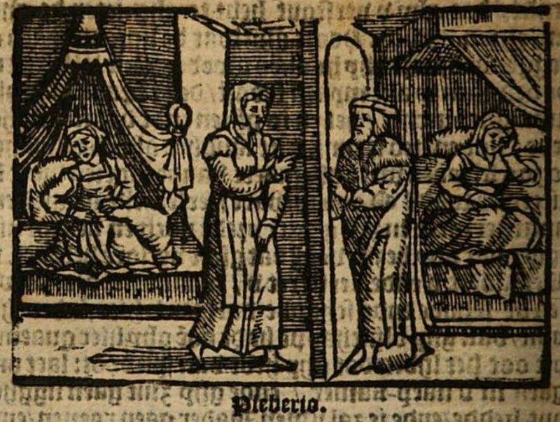 After the death of Calisto, Melibea plunges into sadness and despondency. Lucrecia hurries to Pleberio’s bedchamber to inform him of his daughter’s illness, and Pleberio rushes to her aid. She explains to him that she is afflicted by a pain in her heart that has no cure, and he asks her to join him for some fresh air. Once outside, she asks him to bring her some musical instruments, and he leaves to fulfill her request. She and Lucrecia climb to the top of her house’s tower, but she tells Lucrecia that the height is making her uncomfortable. As Lucrecia enters the staircase, Melibea slams the door and locks herself in the tower alone. From atop the tower she reveals to Pleberio (who is on the ground below) her passionate love for Calisto, and proceeds to take her own life by jumping.The left side of the image depicts Melibea and Lucrecia. Melibea is likely the figure seated on the ornate and draped bed, while Lucrecia is approaching the door with her finger pointed toward Pleberio. Each of the them is wearing a robe and a veil. The right side of the image depicts Pleberio, wearing a hat and a cloak of sorts, as he opens the door for Lucrecia. Meanwhile, Alisa sits on another ornate and draped bed, displaying an air of sadness at the thought that Melibea is unwell.The entire image is identical to the one found on page 231 of the text.