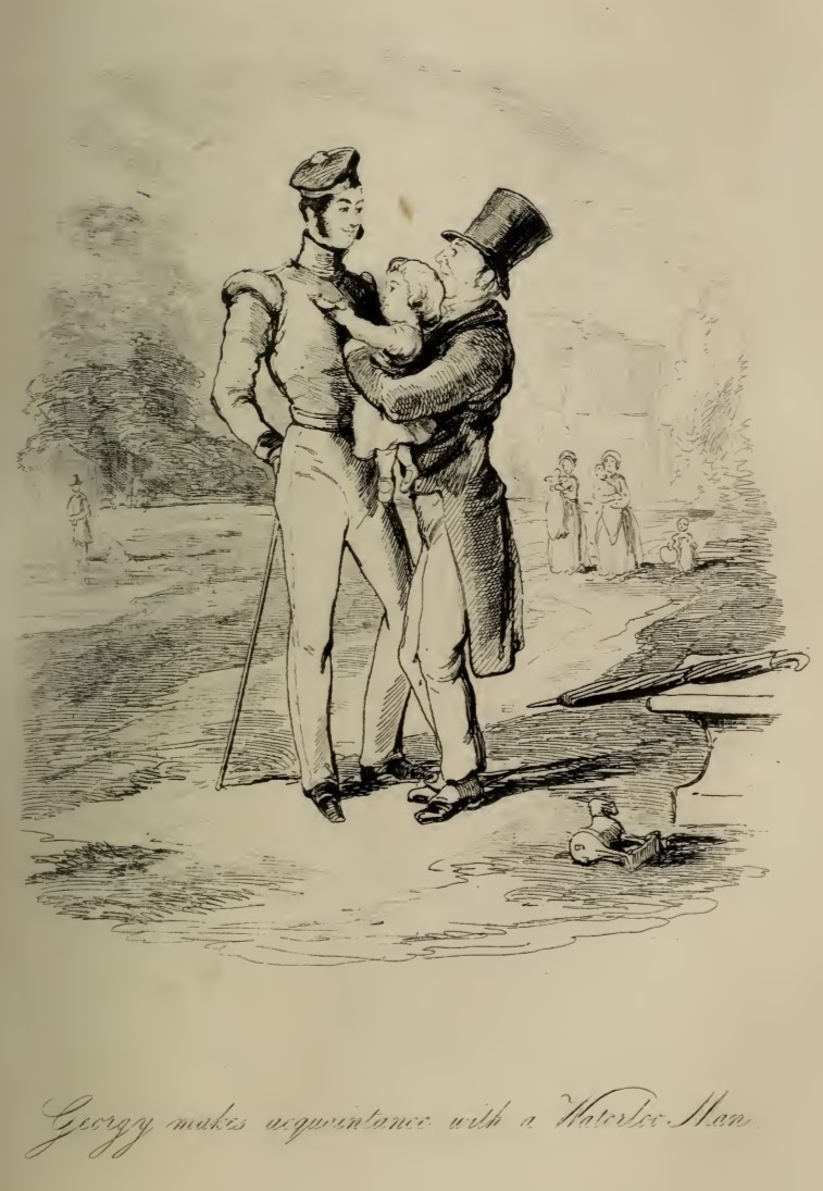 On a walk in the park, Corporal Clink, carrying a thin walking stick, is talking to John Sedley, in a top hat and coat. Georgy Osborne, held in the arms of his grandfather, has reached out to grab the Corporal’s medal. An umbrella is laying on the bench next to them, with a toy horse on the ground beneath it. In the background are a man, two women, and three small children. Below the illustration is printed in cursive its title, Georgy makes acquaintance with a Waterloo Man.