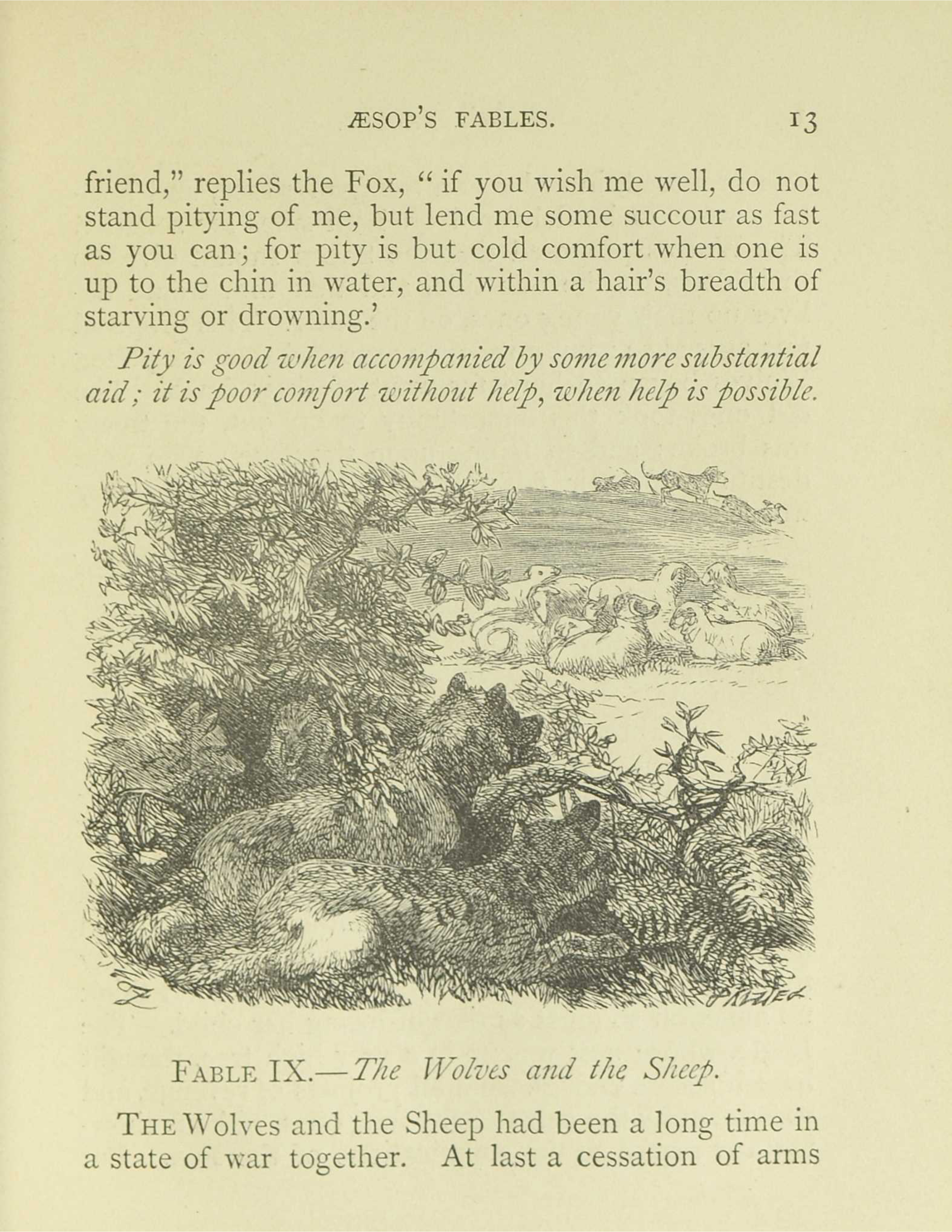 The wolves and the Sheep had been a long time in a state of war together. At last a cessation of arms was proposed, in order to a treaty of peace, and hostages were to be delivered on both sides for security. The Wolves proposed that the Sheep should give up their dogs, on the one side, and that they would deliver up their young ones.