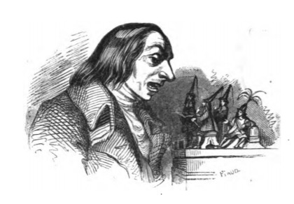 In this image we see Gulliver speaking to four Lilliputian pages, who were assigned to Gulliver’s household by the Emperor. The pages stand on a box, looking up to Gulliver. The pages wear conical hats with plumes coming out of the top. The same image appears in the 1839 Krabbe edition.