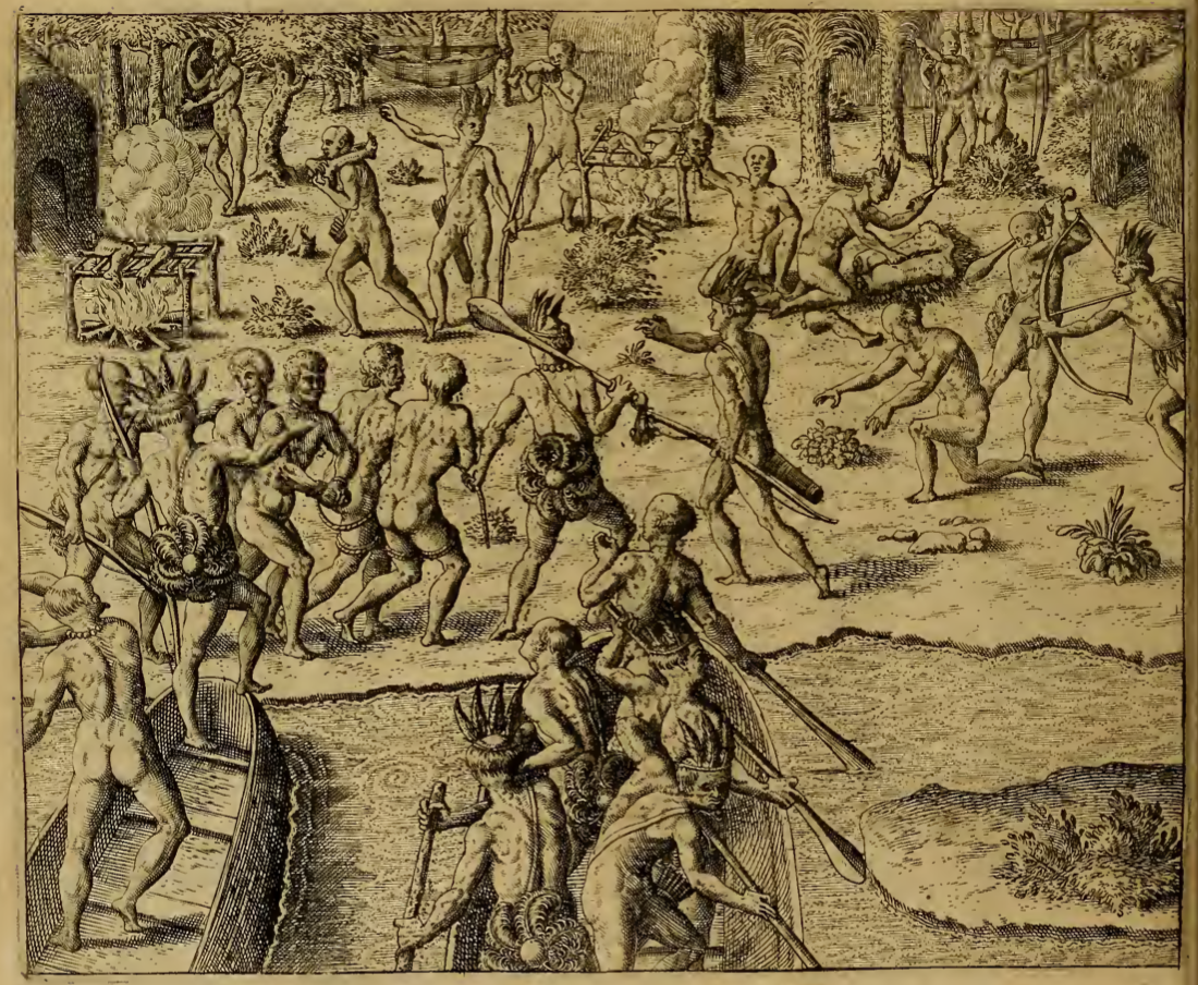 A group of Tupinambá men return by canoe to their village. They have four male captives who are tied together with rope around their thighs and wrists. Presumably the scenes of cannibalism depict the fate of the captives. To the right a man kneels on the ground with both arms outstretched while two other men stand behind him: one with a club raised above his head poised to swing and the other with an arrow nocked and aimed at the kneeling man. Behind them a human torso lays on the ground, having had its limbs and head removed. In the background (center) and to the left there are two fires with wooden frames set over them; human limbs have been set on the frames to roast over the fire.