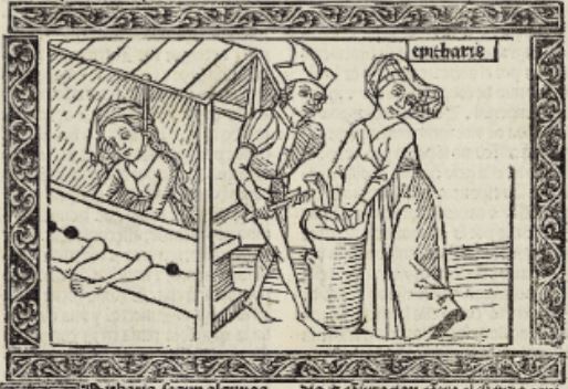 This engraving depicts the freedwoman, Epicharis, being tortured for information regarding a conspiracy to kill emperor Nero. Epicharis is depicted on the right side of the engraving with her hands in some form of torturing device as a man with a hammer tortures her. Her name, written as Epitharis is engraved above her head to identify her. Epicharis is also depicted on the left side of the image with her feet restrained in a stock. Epicharis had heard the details of the conspiracy to assassinate Emperor Nero, and when she put her faith in the wrong person, they told emperor Nero that she was involved in the plan. They tortured her many times; however, she did not reveal the names of anyone involved in the conspiracy. She ended up killing herself to avoid revealing the details to the emperor.