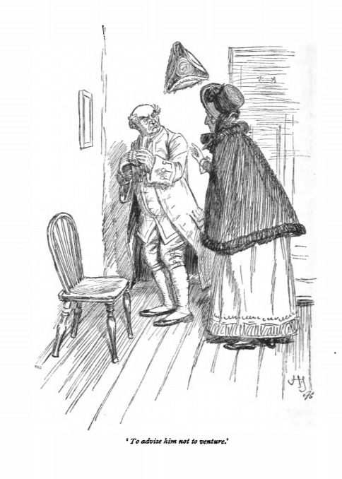 Here we see Mrs. Norris speaking with the coachman. Sir Thomas expressed his disappointment that she did not try and persuade his children not to put on the play. Not knowing how to respond to this, Mrs. Norris tells him all of the things that she handled well while he was absent in Antigua. The example seen in this image here is Mrs. Norris advising the coachman not to go out in a storm. Sir Thomas eventually gave up because she kept deflecting his reprimands.This scene occurs in chapter 20. The characters are shown in the traditional regency style. Mrs. Norris wears a regency style dress with a cloak and a bonnet. The coachman wears a waistcoat and an overcoat, with breeches and a cravat. His tricorn hat is seen on the wall behind him. The regency period dated to the early nineteenth century (1811-1820) when George, Prince of Wales, later George IV (r. 1820-1830), reigned as regent for his mentally ill father, King George III (r. 1760-1820). The regency period is associated with the rise of neoclassicism in art and fashion.