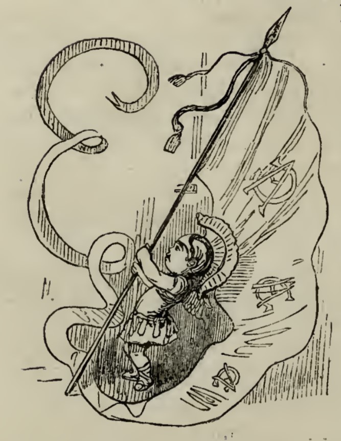 A small figure in a Roman helmet and uniform holds onto a pole twice as tall as he is. The pole is tipped with a spear point and a trailing banner is tied to it with a tasseled rope. The banner itself is decorated with symbols similar to the letters A and C overlapping, while the tails curls to form the letter E from Enemies.