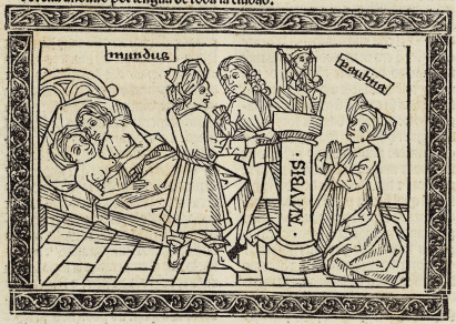 The Roman woman Paulina is depicted on the right side of the engraving as she kneels in prayer. She is looking up at the statue of the Egyptian god Anubis. Paulina’s name is engraved above her head at the top of the image to identify her. The statue of Anubis is sitting on a tall platform, with the name Anubis engraved on the platform. Paulina was an incredibly devout and chaste woman and was completely faithful to her husband. A man named Mundus had fallen in love with Paulina due to her overwhelming beauty, and when she continuously rejected his advances, he devised a plan to have her as his own. Mundus is depicted in the centre of the engraving handing a bag of money to a priest. Mundus bribed the priest of the temple to invite Paulina to sleep at the temple to have an encounter with the god Anubis in her sleep. Paulina stayed at the temple, expecting to have an experience with Anubis, however, Mundus came to Paulina in her sleep and pretended to be the god and convinced her to have intercourse with him. This is depicted on the left side of the engraving. Paulina and Mundus (disguised as Anubis) are illustrated in bed together after having intercourse. Paulina is famous for having been tricked into losing her virtue and chastity. Mundus ended up being exiled, and the priest was tortured for his involvement in the deception.