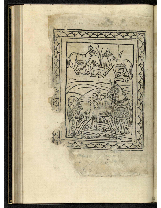 In foreground is an army horse with all its armor on the right side. To the left is a donkey, or a smaller horse, that is slightly bent forward. The smaller horse seems intimidated by the army horse. In the background, a small donkey and a small horse face each other. The horse, which is on the right, seems to be walking towards the donkey. The donkey, that is on the left, seems to be walking backwards, away from the horse.