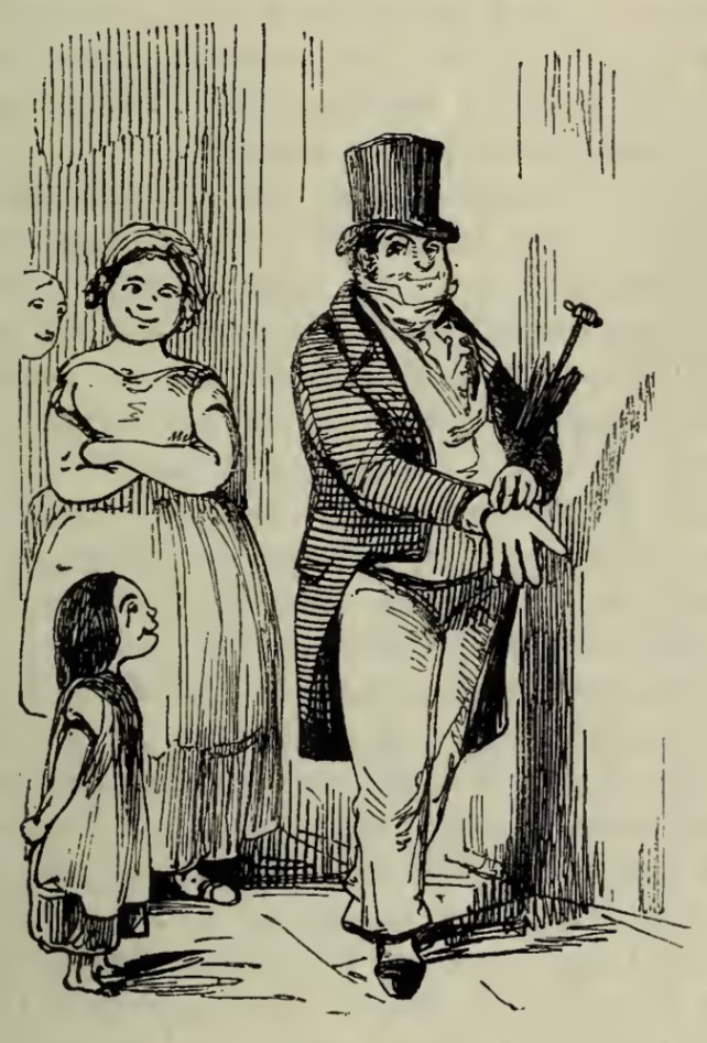 Mr. Chopper, Mr. John Osborne’s clerk, has dressed in his best suit and frilled shirt to meet his client. He is putting on his gloves and has an umbrella tucked under one arm. Beside him, his wife is smiling with her arms folded, and one of his daughters looks up at him eagerly with her hands behind her back. Another one of his children can be seen peeking around the corner.