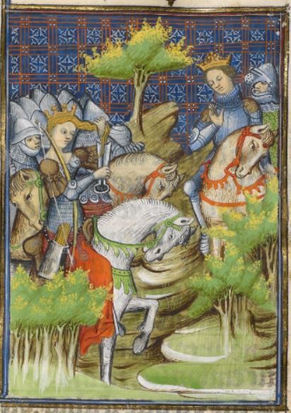 This illumination depicts Hypsicratea, the wife of King Mithridates VI of Pontus, riding horseback on the left side of the image. Mithridates is depicted on the right side of the image, also riding a horse. There are many soldiers depicted behind Hypsicratea. Boccaccio explains that Hypsicratea is praiseworthy as she bravely risked her life as she regularly followed her husband on his military expeditions, which is why she is illustrated riding horseback with soldiers surrounding her in this image. She is illustrated with long blond hair to be differentiated from the male soldiers.