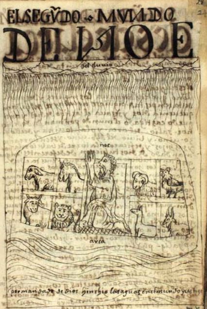 Felipe Guaman Poma de Ayala has depicted a biblical story from the Book of Genesis in this illustration. This image depicts Noah and the Flood, with Noah illustrated in the centre of the image kneeling as he looks up and prays to God. Surrounding Noah are all the animals that he was instructed to bring on the Arc with him to avoid the flood. The name Noé is written above Noah’s head to identify him. The word arca is written just below the arc. There is a caption at the bottom of the image that reads, Por mandado de Dios hinchió las aguas en el mundo y castigó which translates to By God's command he swelled the waters in the world and punished.
