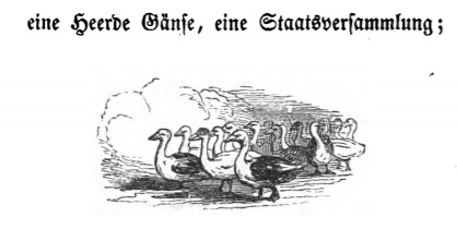 This image is of a herd of geese representing a senate. This image comes in a description of a conspiracy found by a professor from the Grand Academy on Balnibarbi. This idea is representing code word for terms in the conspiracy that Swift is satirizing. The professor advises that those named in the conspiracy plan be closely monitored at all times, naming specifically while they were using the bathroom, as this is when men were most thoughtful. This conspiracy is thought to be an allusion to the trial of Francis Atterbury, the bishop of Rochester for allegedly plotting with the Jacobites. Atterbury was charged with treason in 1722 and was exiled to France. The same image appears in the 1839 Krabbe edition.