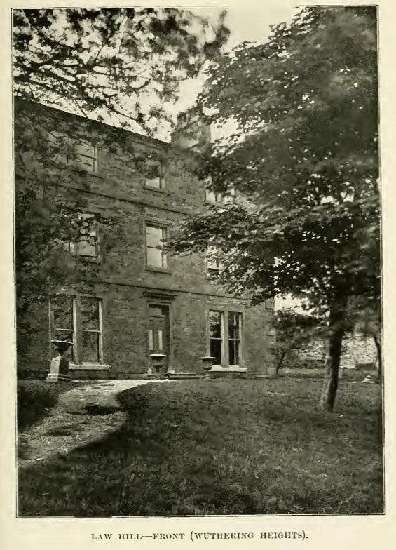 Here we see an image of Law Hill, a house near Halifax, England, on which Emily Bronte based the estate of Wuthering Heights. This image shows the front of the house and the path leading up to the entrance. This is the first in a series of photographs of the house, with others of the back and the outbuilding. The image is a reproduction of a photograph using a technique called photogravure, where photographs are taken on plates which could then be etched on to create a plate for use in a printing press.