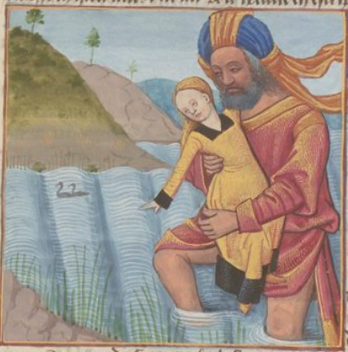 This illumination depicts a man named Metabus, king of the Volscians, carrying his child Camilla safely across a river. Metabus had been banished from his land due to a rebellion, and he brought his only child with him to keep her safe. When the Amasenus River had flooded, Boccaccio explains that Metabus tied Camilla to a lance and launched her across the river to get her across safely. This image, however, depicts Metabus carrying her across.