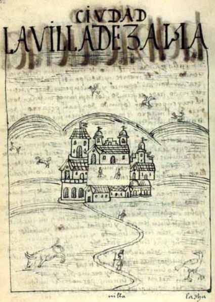 This image is depicted in the author’s chapter where he discusses cities, towns, villages, and provinces in colonial South America. This image depicts the small town of Zaña, Peru. There is a small cluster of buildings which forms a square in the centre of the town. There are two soldiers holding spears walking in the town square. There is a long path outside of the city that leads in and out of the town walls. There are two soldiers depicted walking along the path. There are birds flying above the town and other animals such as dogs and cattle roaming in the open area outside the town. The author describes this town to be full of good, charitable Christians who loved one another. He also explained that they did not have much wealth in silver, gold, or fruit. The caption at the bottom of the image reads, “uilla” [town].