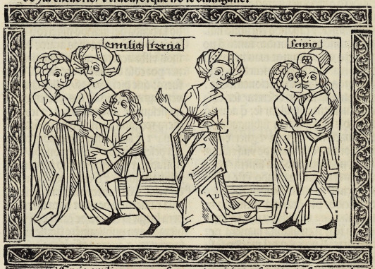 This engraving depicts Scipio Africanus, a Roman general, committing adultery with a young servant girl on the right side of the image. The name Scipio is engraved at the top to identify him. The woman in the centre of the engraving is his wife, Tertia Aemilia. She is depicted looking at her husband and his mistress as they commit adultery. Instead of confronting her husband about the affair, she devises a plan to get rid of the mistress. The left side of the engraving depicts Tertia Aemilia marrying the young servant girl off to a freedman. She does this so that no one finds out about the affair so that it does not ruin her reputation. Her name, written as “Emilia Tertia”, is engraved above her head to identify her. Boccaccio explains that he chose to write on Tertia Aemilia because the way she handled the affair and how she used her cunning was admirable.