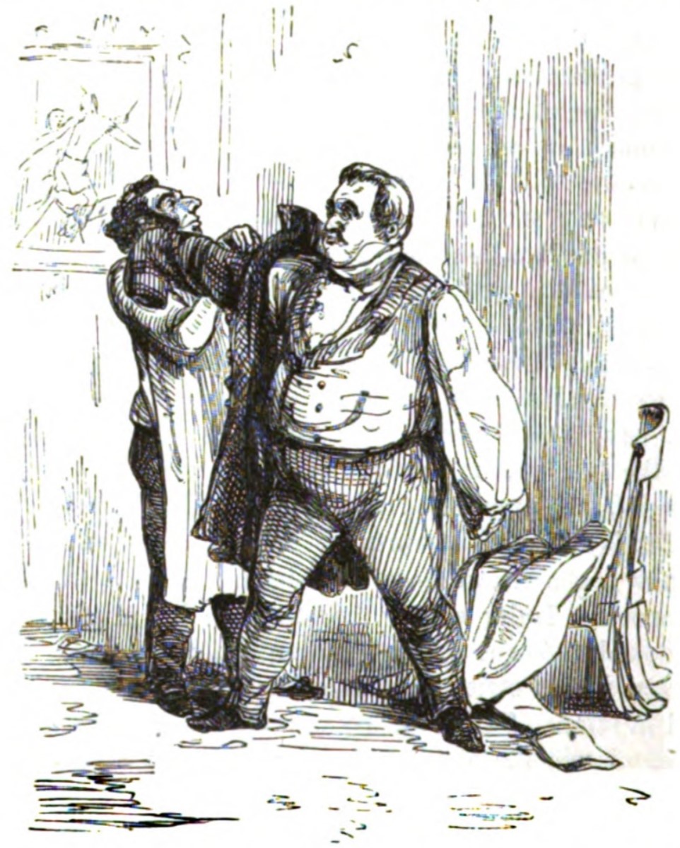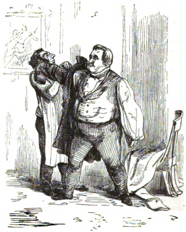 Intending to go out to discover for himself whether the rumors of Napoleon’s victory are true, Joseph Sedley puts on his coat with help from Isidor, his valet. Jos is standing next to a chair over which another coat is draped, and on the wall behind Isidor hangs a large painting.