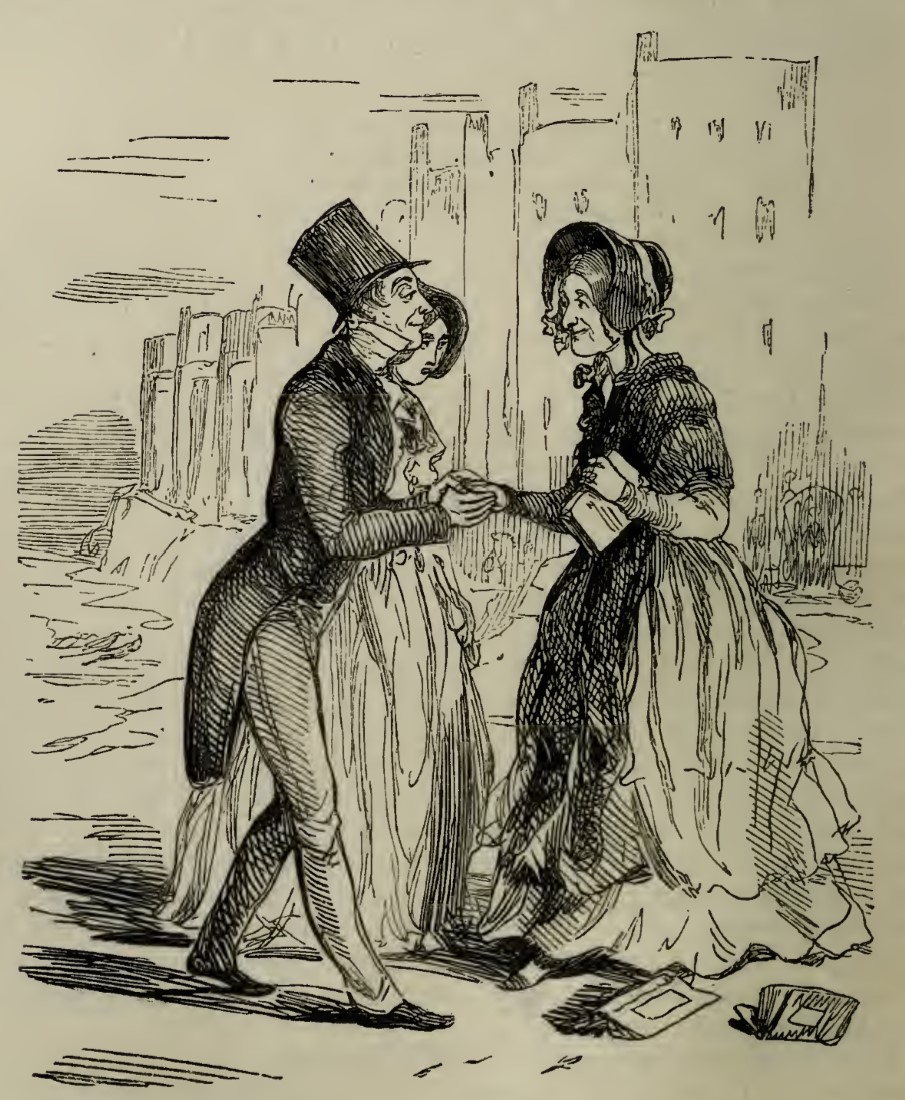 Mr. Pitt Crawley introduces Miss Briggs, his aunt’s companion, to Lady Jane Sheepshanks, his betrothed, with a smug look on his face. Miss Briggs, on her way home from the library, is holding one of her books and has dropped two others. Lady Jane is half hidden behind Mr. Crawley, looking shy.