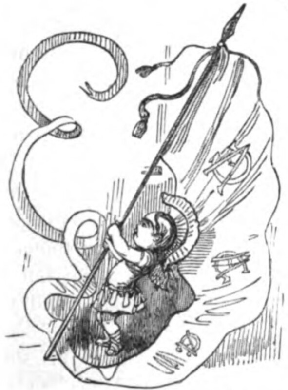 A small figure in a Roman helmet and uniform holds onto a pole twice as tall as he is. The pole is tipped with a spear point and a trailing banner is tied to it with a tasseled rope. The banner itself is decorated with symbols similar to the letters A and C overlapping, while the tails curls to form the letter E from “Enemies”.