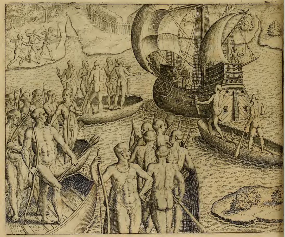[Tupinambá people in canoes approach a large European ship]