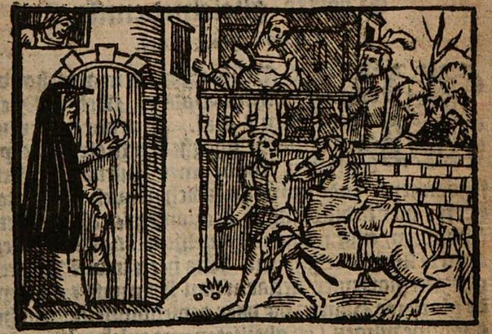 In the foreground and to the left, we see a female figure knocking on the door to a house. Her long veil and slightly more aged appearance indicate that this is meant to represent Celestina. In her left hand she is holding either a lantern or a bag. In the foreground and to the right, we see a male figure (Calisto?) walking toward the house with a horse. A female figure (Melibea?) watches from a window in the top left corner, and two other figures (perhaps Melibea’s parents Alisa and Pleberio) watch from a balcony.The entire image is identical to the one found on the title page.