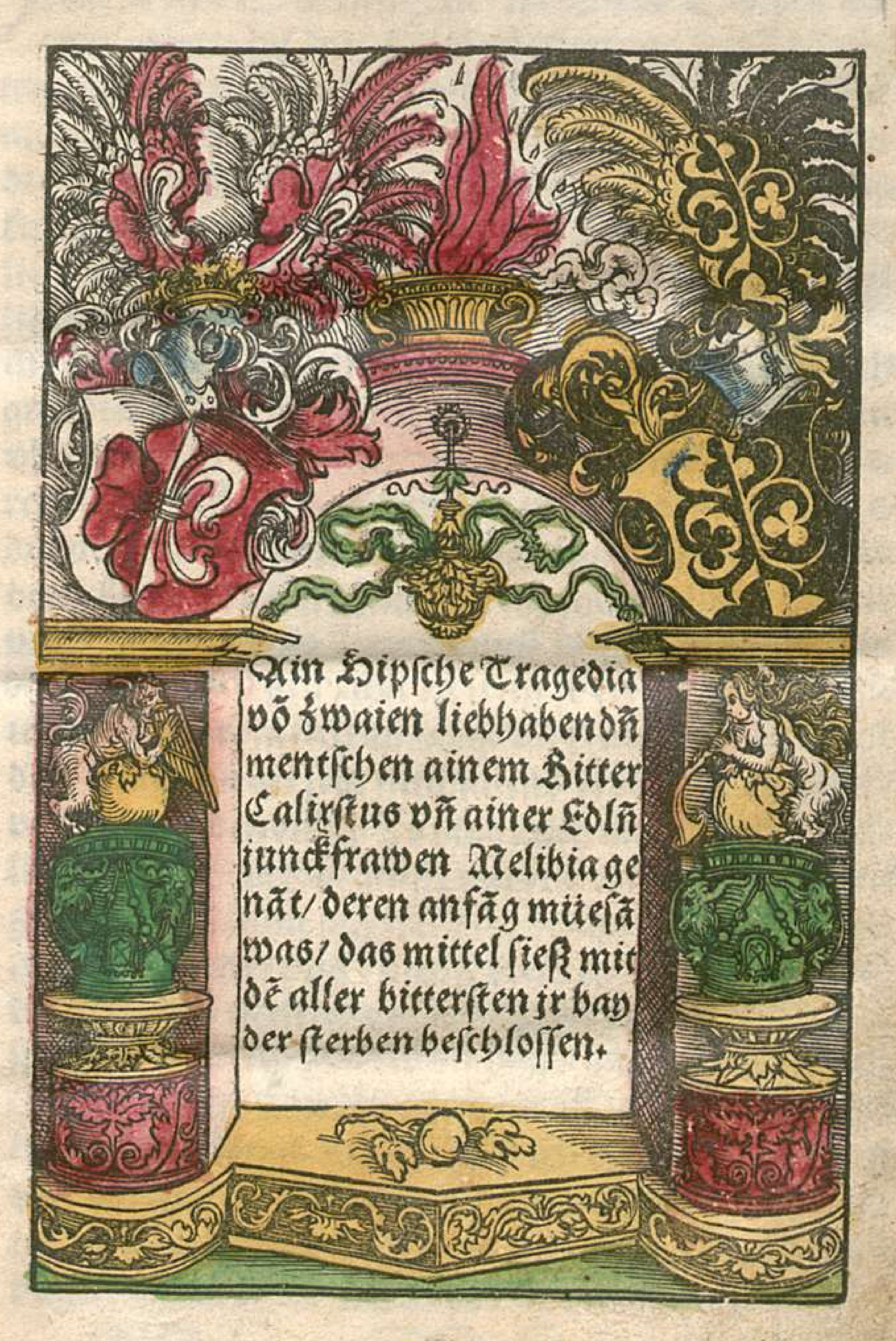 Ain hipsche Tragedia von zwaien liebhabenden mentschen ainem Ritter Calixstus unn ainer Edlen junckfrawen Melibia genannt/ deren anfang müesam was/ das mittel sieß mit dem aller bittersten ir bayder sterben beschlossen.